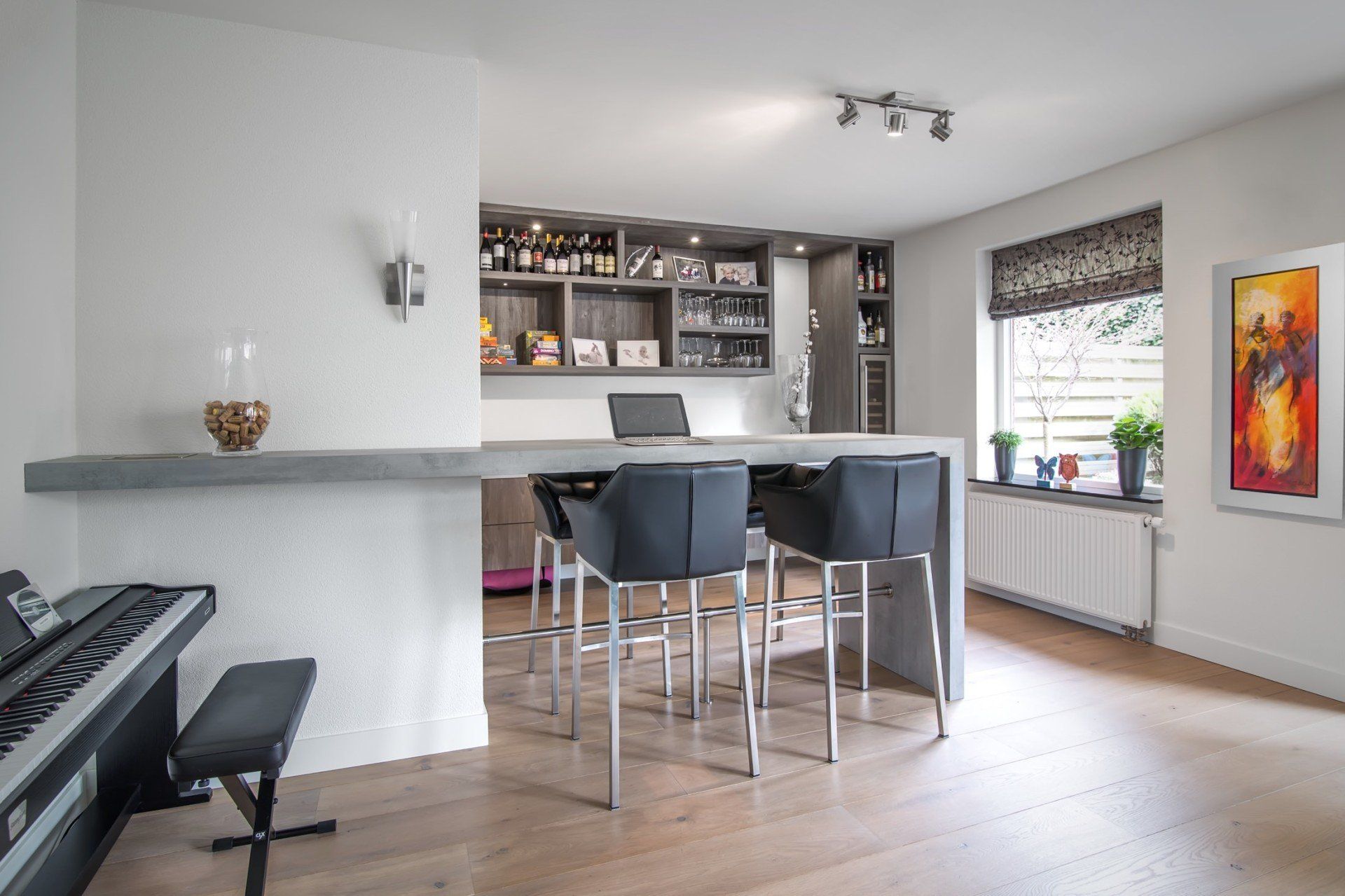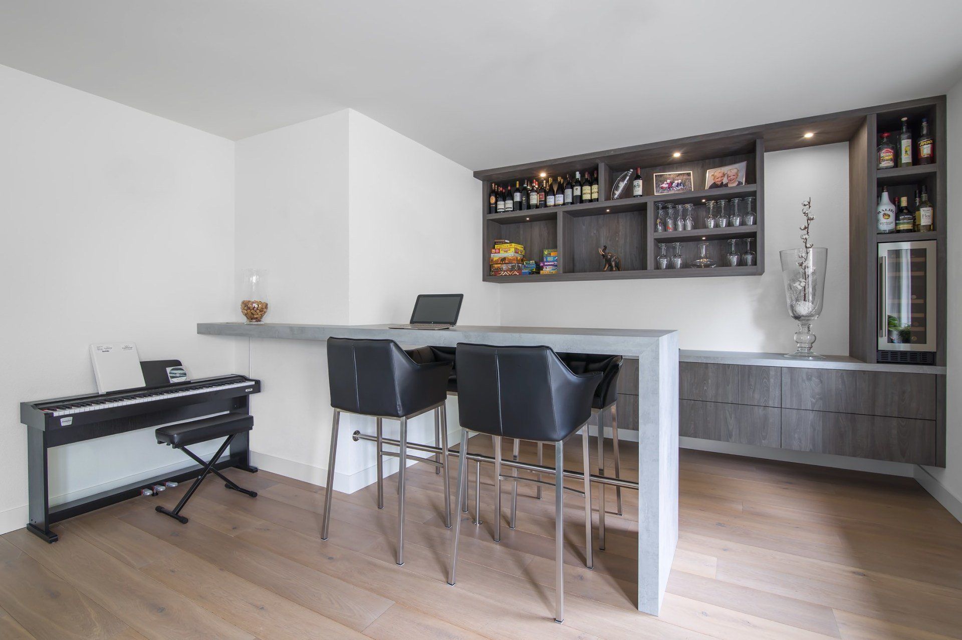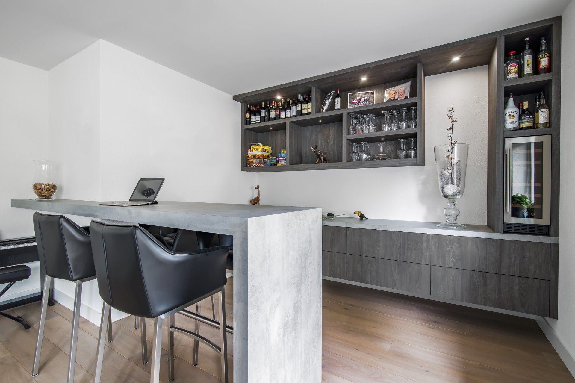 De kasten van het barmeubel zijn gemaakt van gemelamineerd plaatmateriaal in de structuur Sherwood van het merk Decolegno. Rechts in het meubel is een wijnklimaatkast gemonteerd.