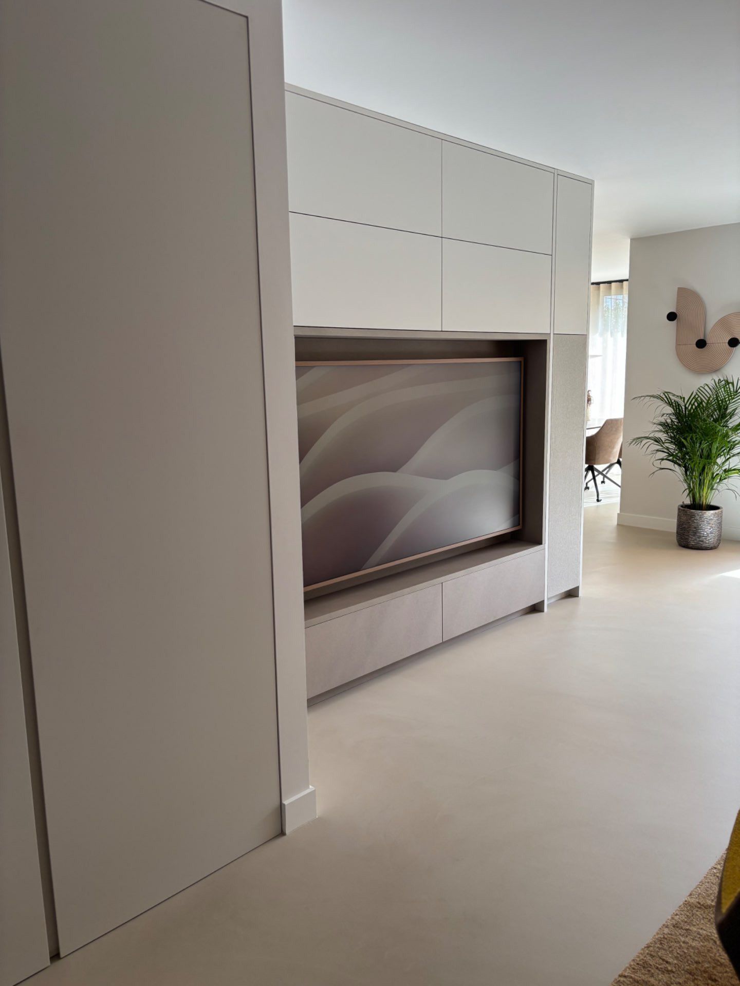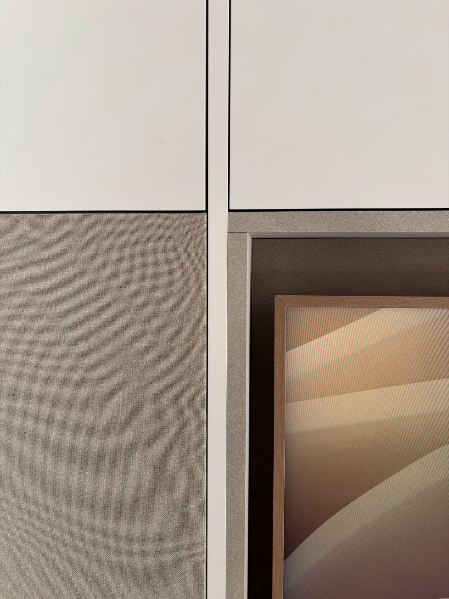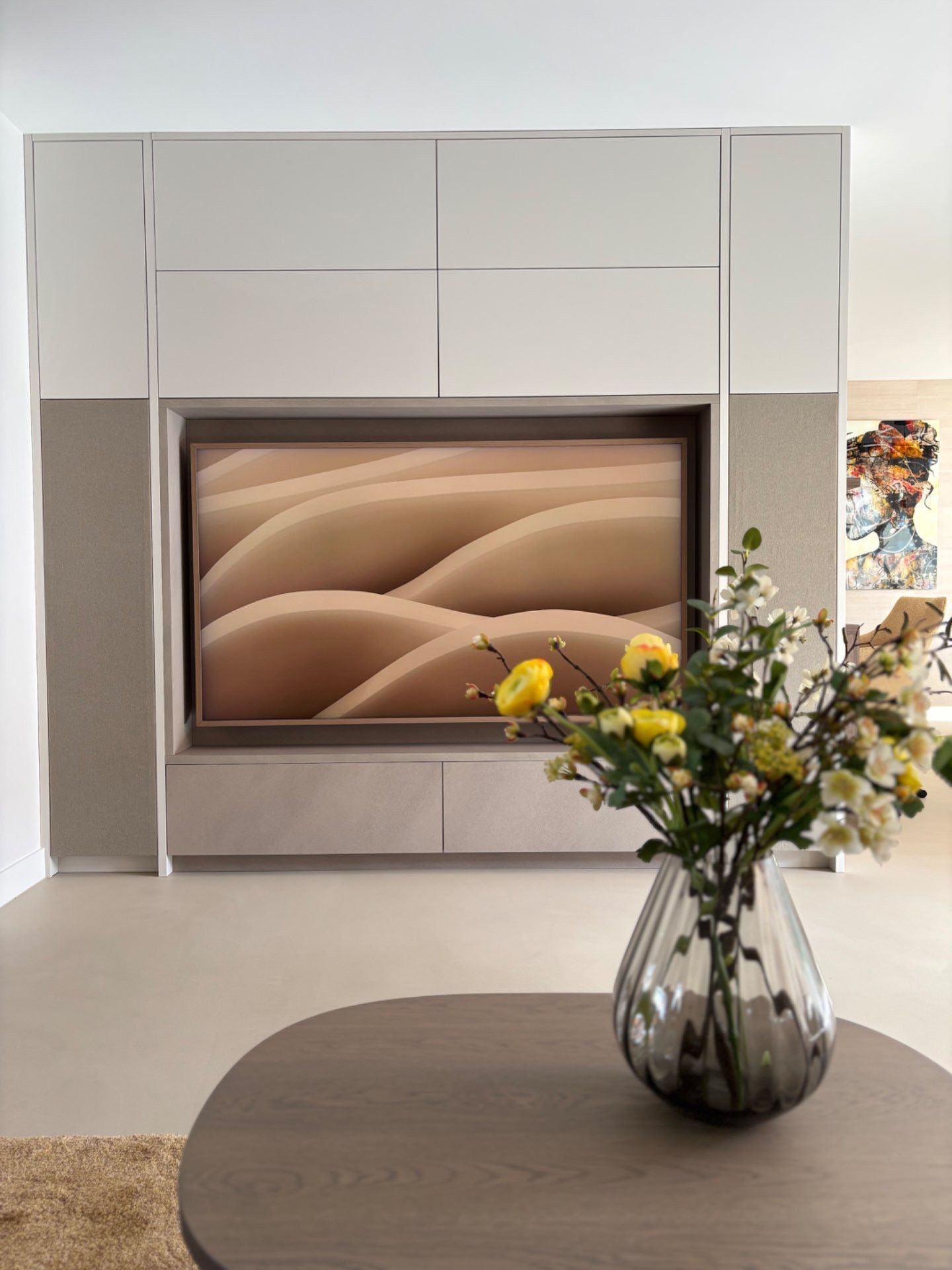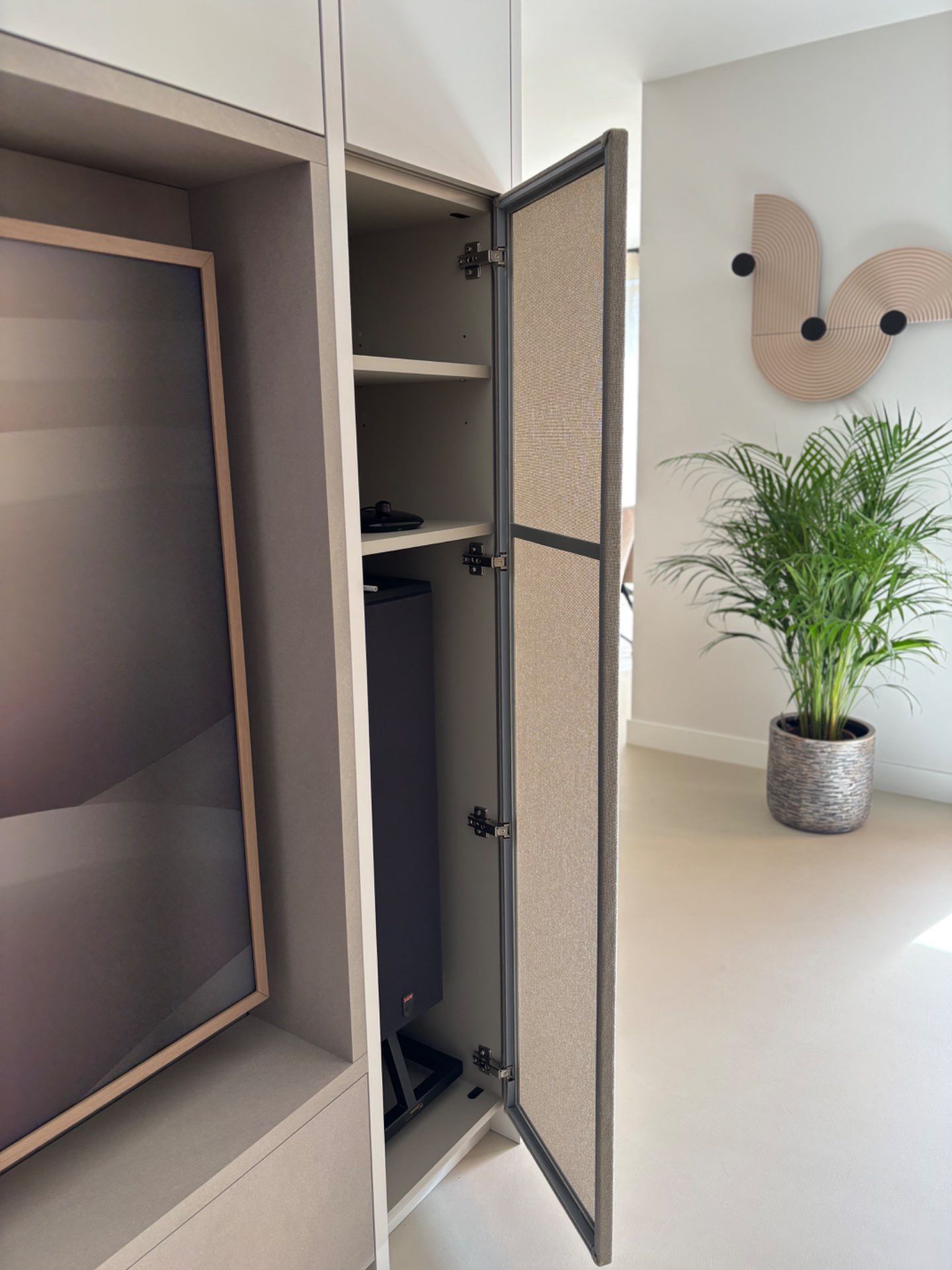 Minimalisme op zijn best. Deze op maat gemaakte cinewall brengt rust in de woonkamer door alle techniek naadloos te laten verdwijnen. Met de Samsung Frame TV als kunstwerk aan de wand en een subtiel speakerdoek dat prachtig opgaat in het geheel, geniet je van topkwaliteit zonder de visuele ruis.