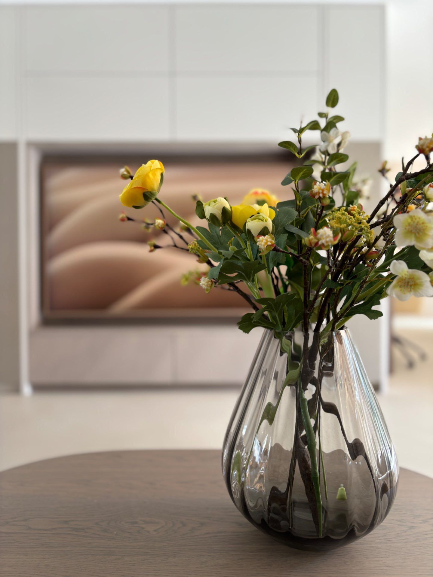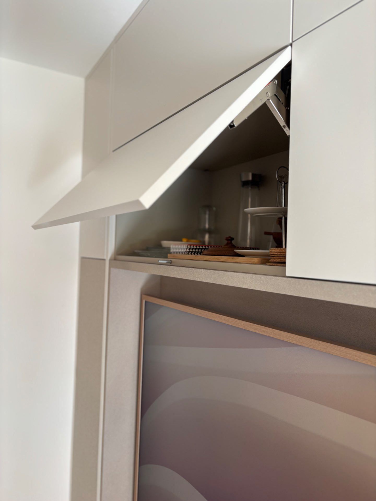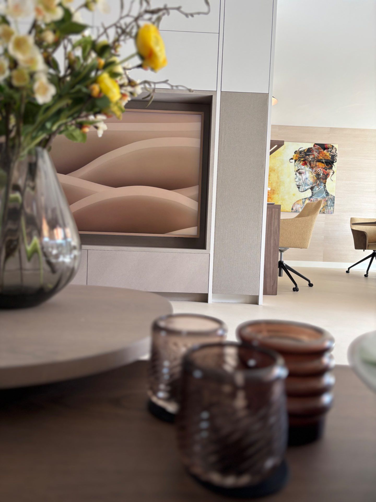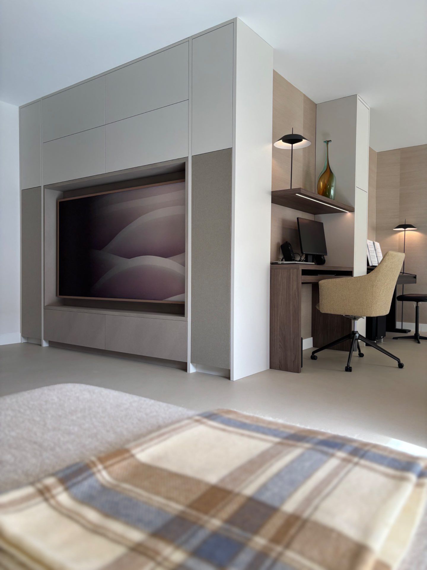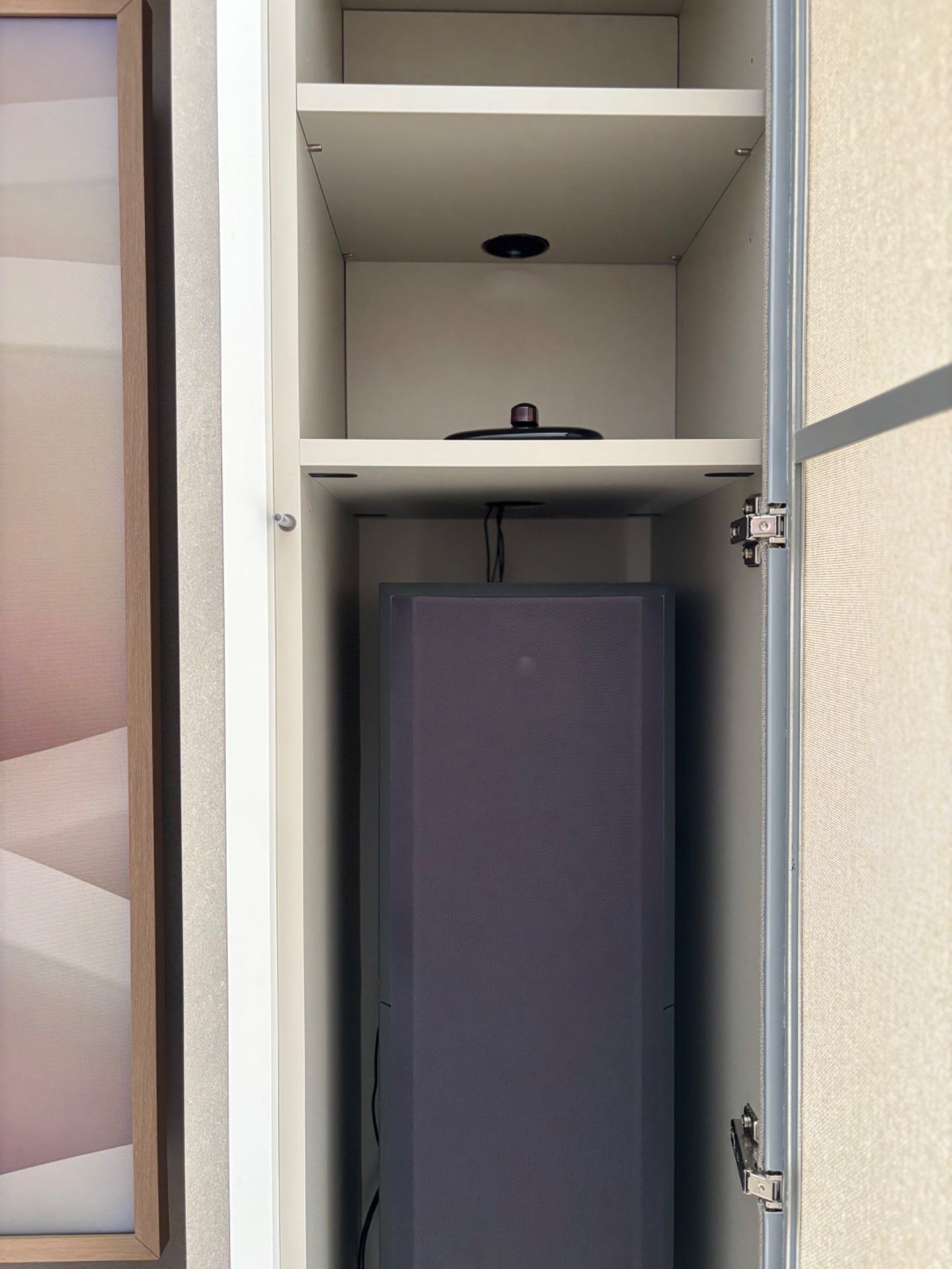 Minimalisme op zijn best. Deze op maat gemaakte cinewall brengt rust in de woonkamer door alle techniek naadloos te laten verdwijnen. Met de Samsung Frame TV als kunstwerk aan de wand en een subtiel speakerdoek dat prachtig opgaat in het geheel, geniet je van topkwaliteit zonder de visuele ruis.