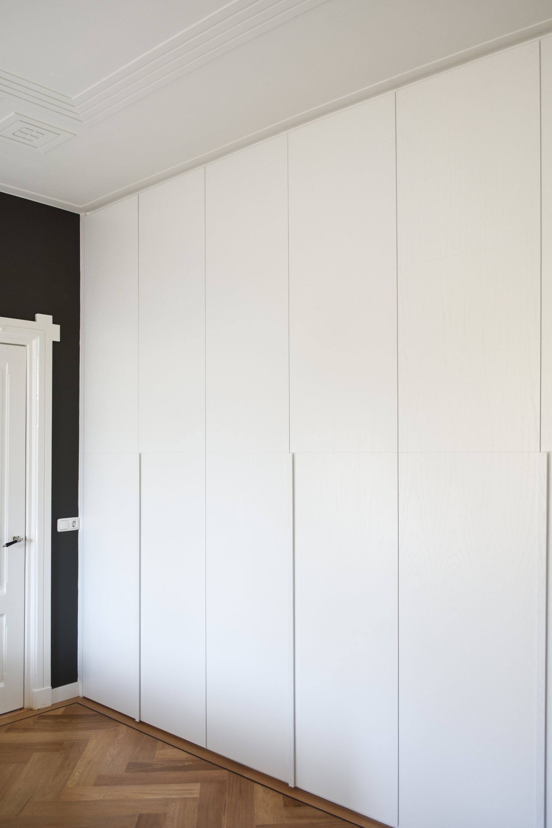 Het zichtwerk van deze mooie, strakke slaapkamerkast is gemaakt van gefineerd eiken wat is gespoten in de kleur RAL 9016 zijdeglans. De binnenkasten zijn uitgevoerd in Finsa 030 wit.
