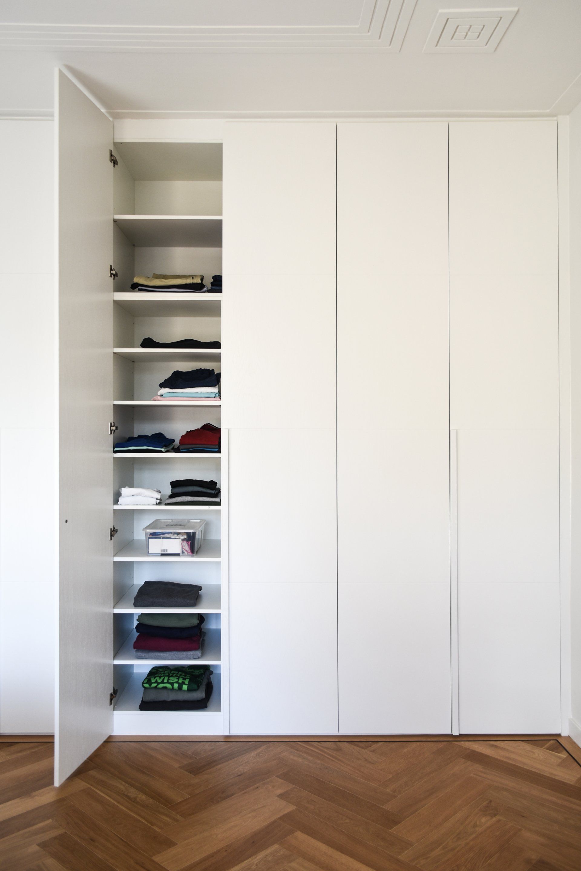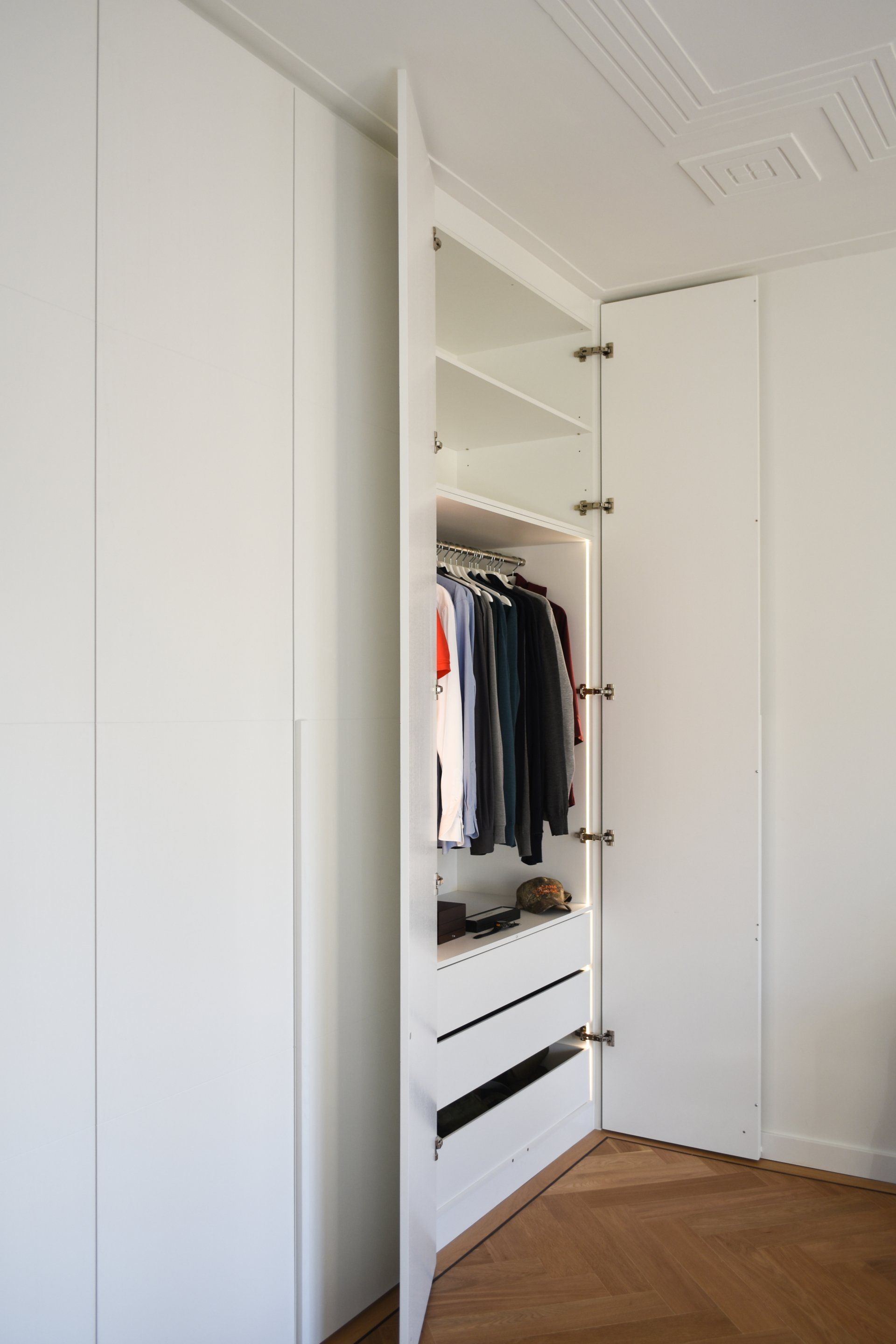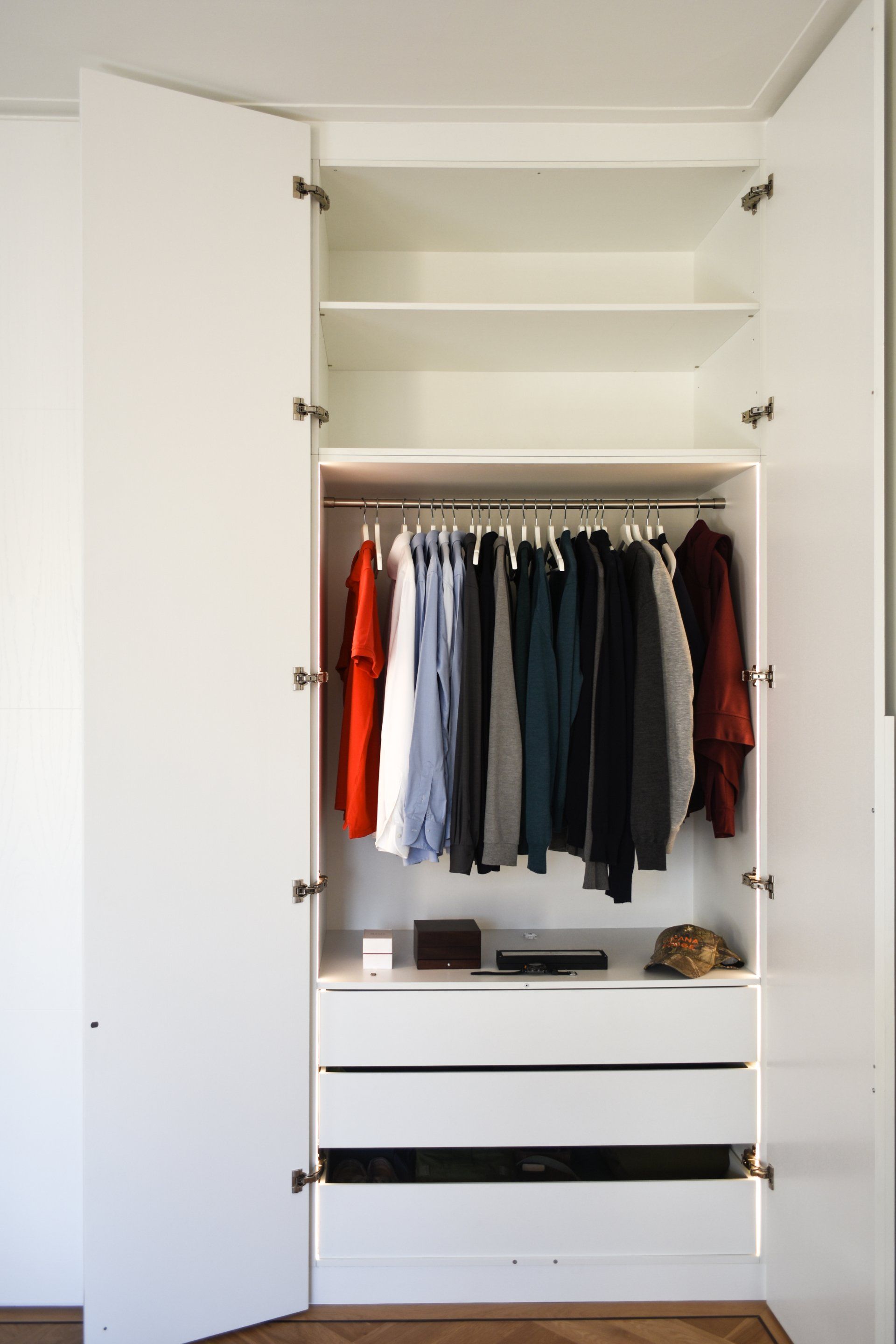 In de kast zijn naast legplanken en lades ook verschillende hanggedeeltes gemaakt. Deze hanggedeeltes zijn allen voorzien van een ledstrip aan de zijkant. In de 3e deur van links en de derde deur van rechts is een spiegel ingefreesd.