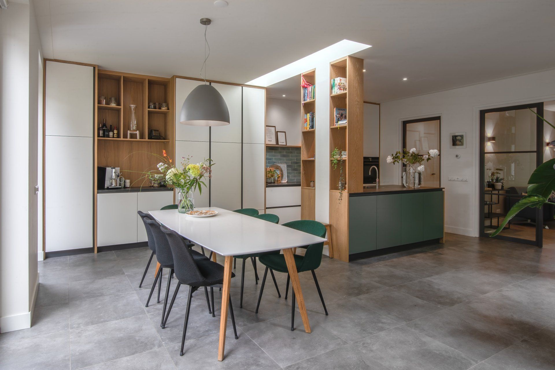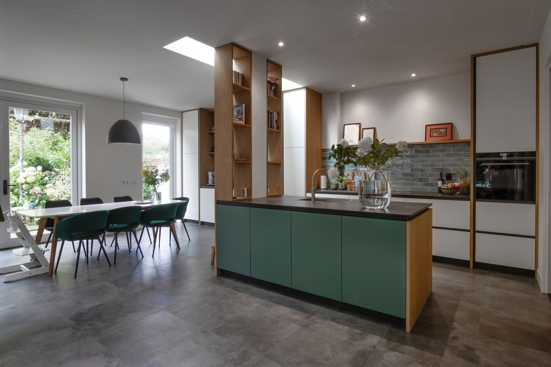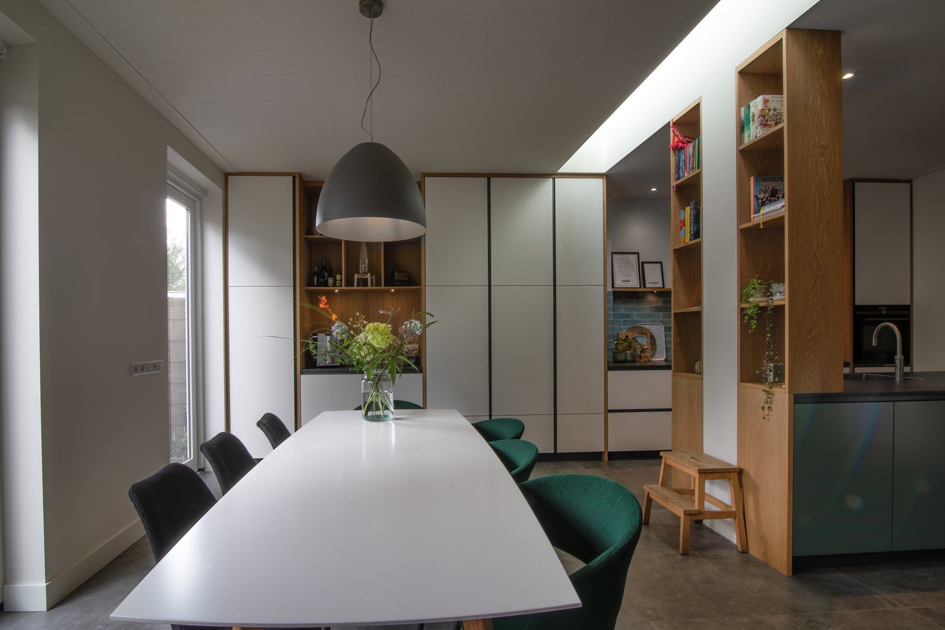 De combinatie tussen de materiaal geeft de keuken een stijlvolle uitstraling.