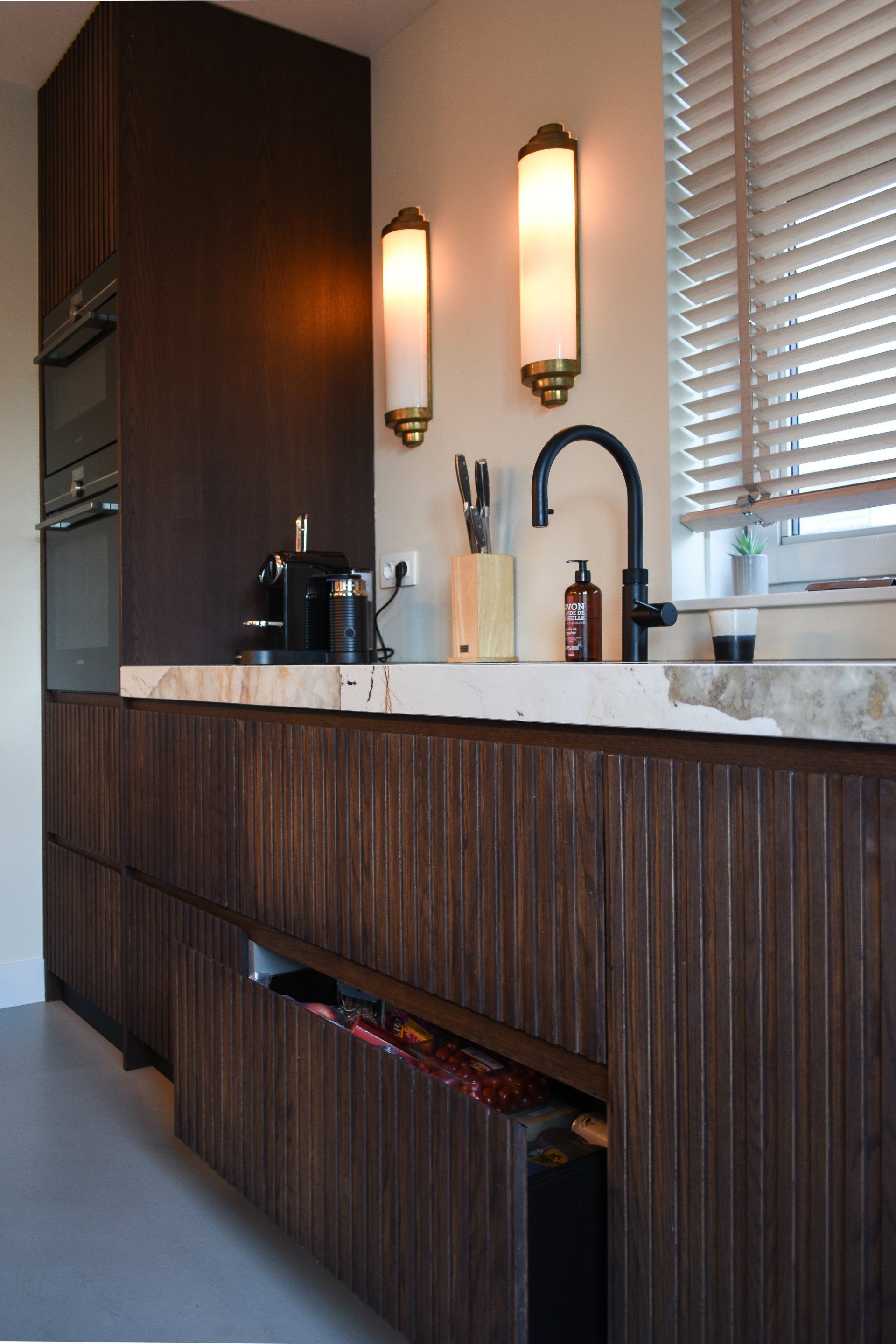 Het zichtwerk van deze gave keuken is gemaakt van massief eiken. In de fronten hebben wij verticale frezingen aangebracht. De afwerking van de fronten is olie.