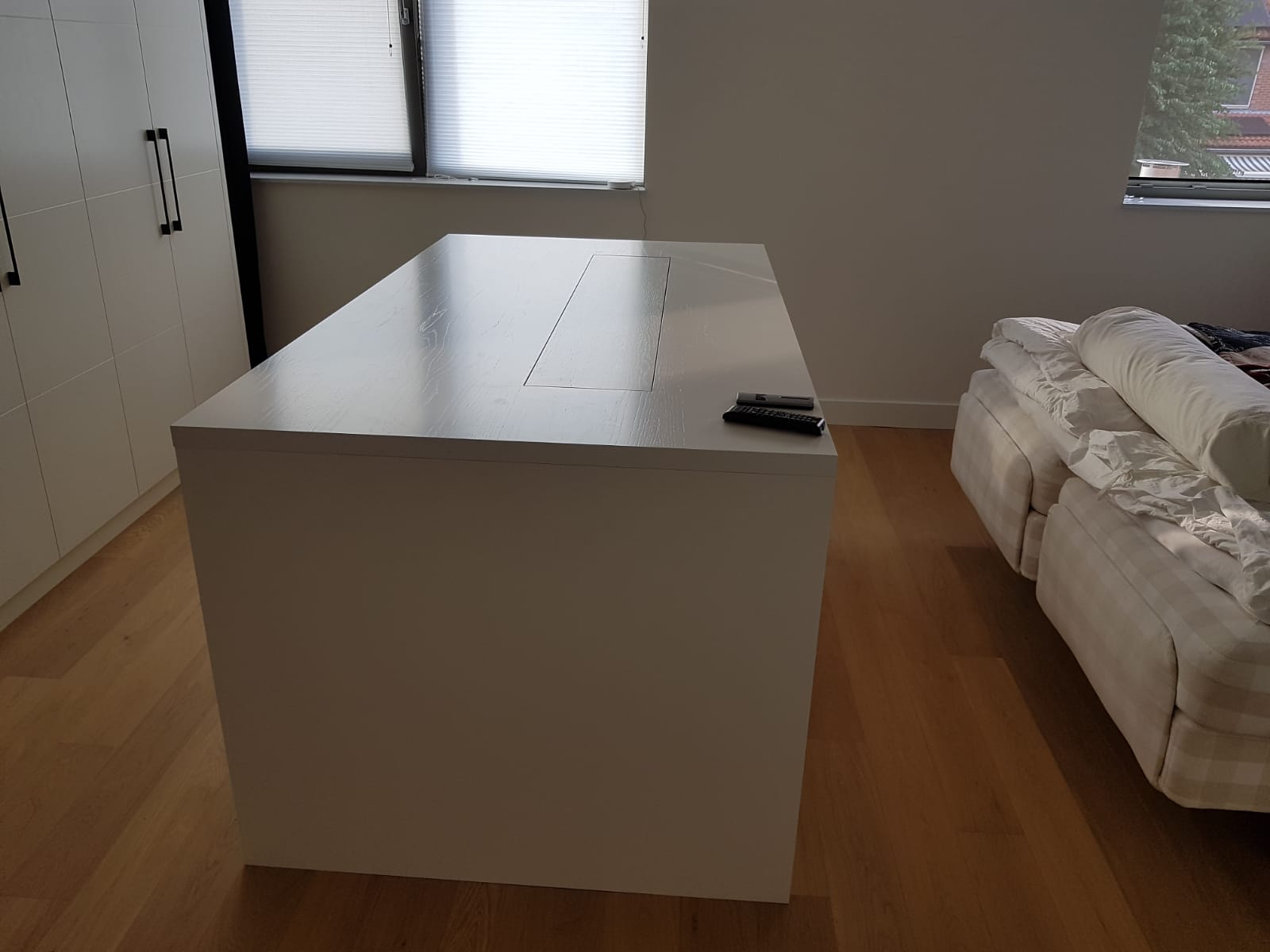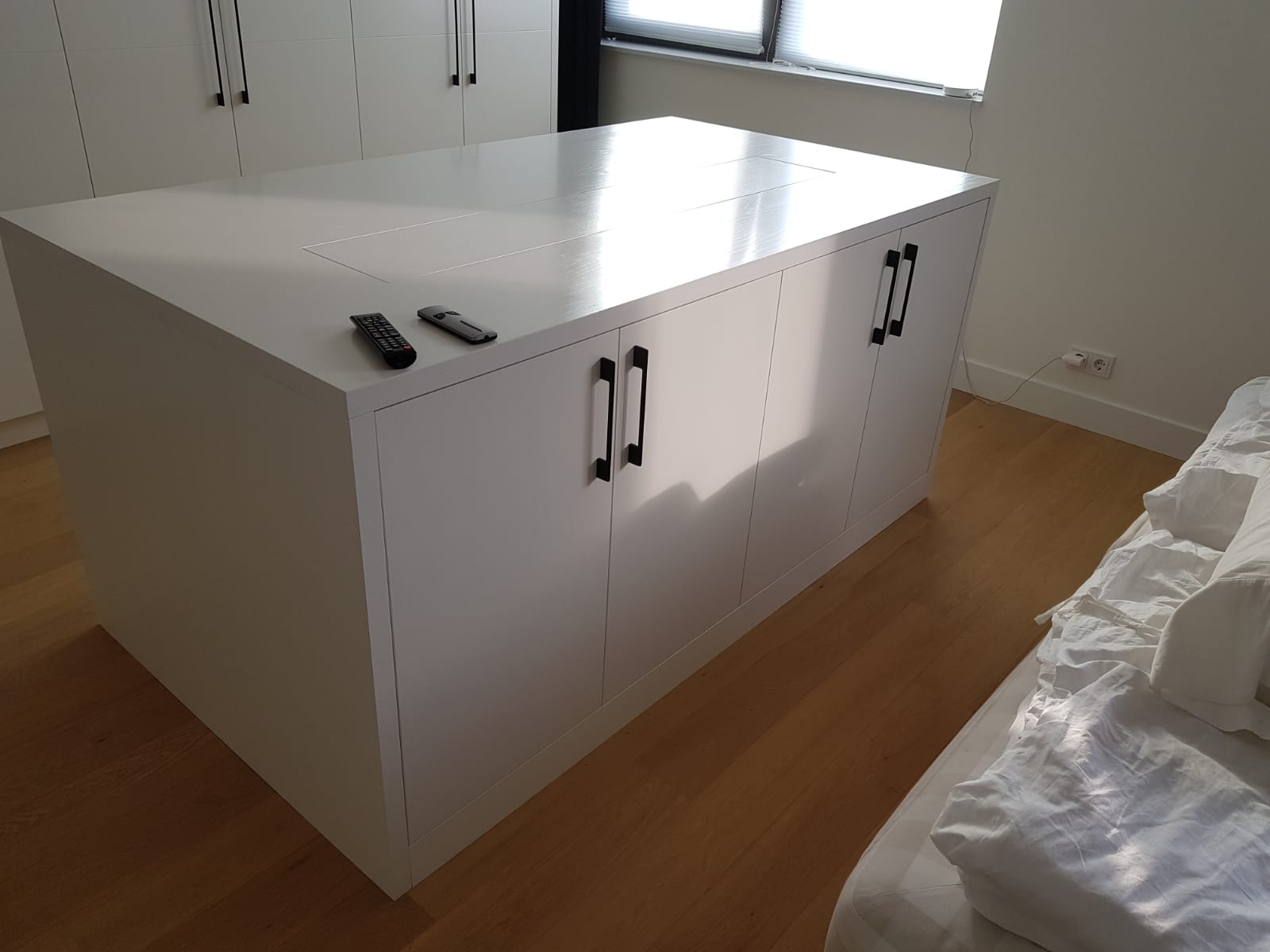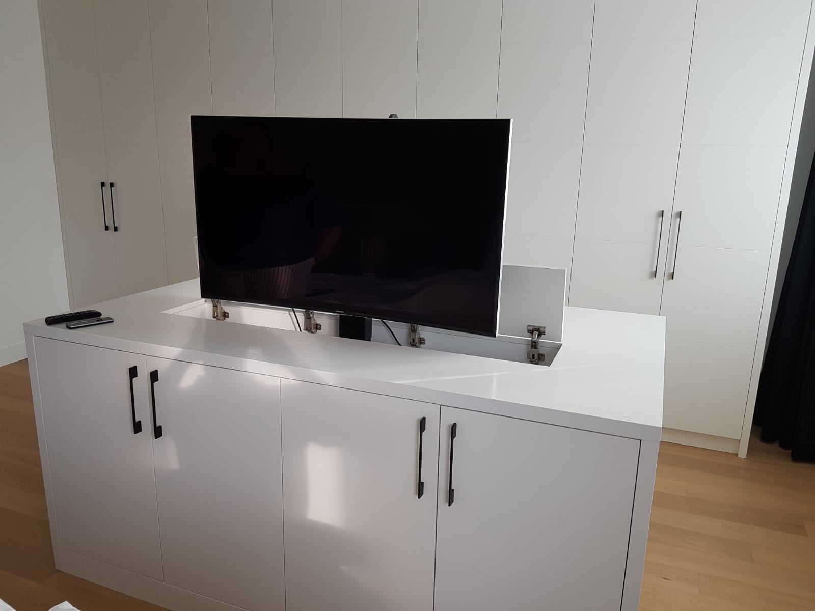 Aan de achterkant van de Tv-lift zijn schoenenrekken geplaatst zodat de kast optimaal wordt benut aan beide zijdes!