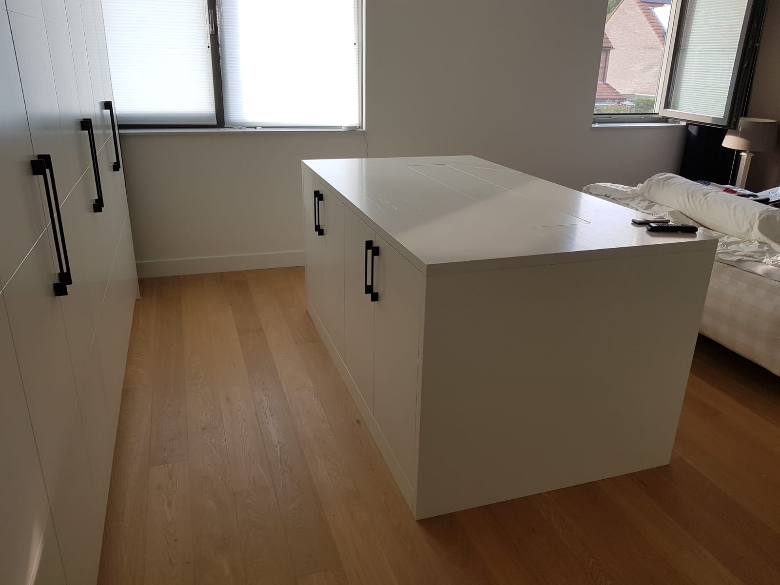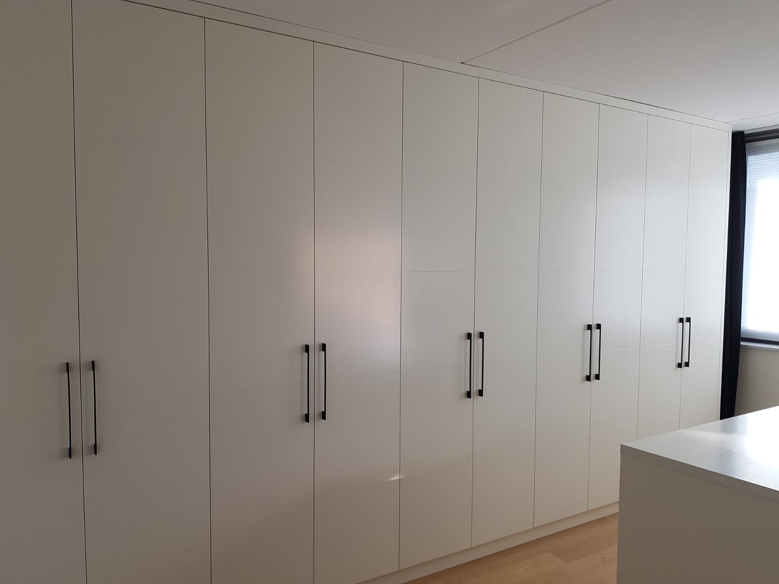 Een chique kledingkast waarvan het zichtwerk volledig is uitgewerkt met gefineerd eiken wat is gespoten in de kleur RAL9010.