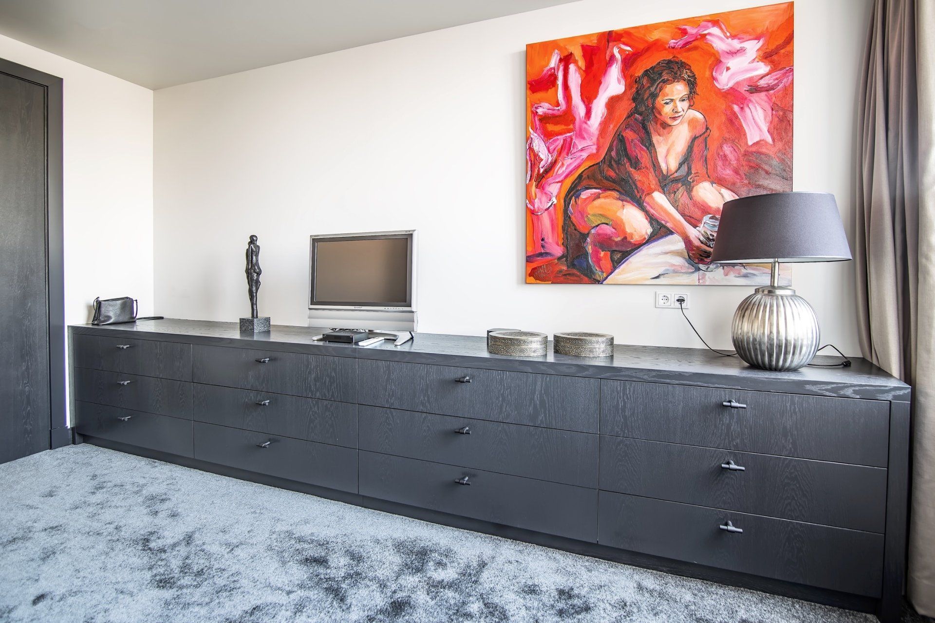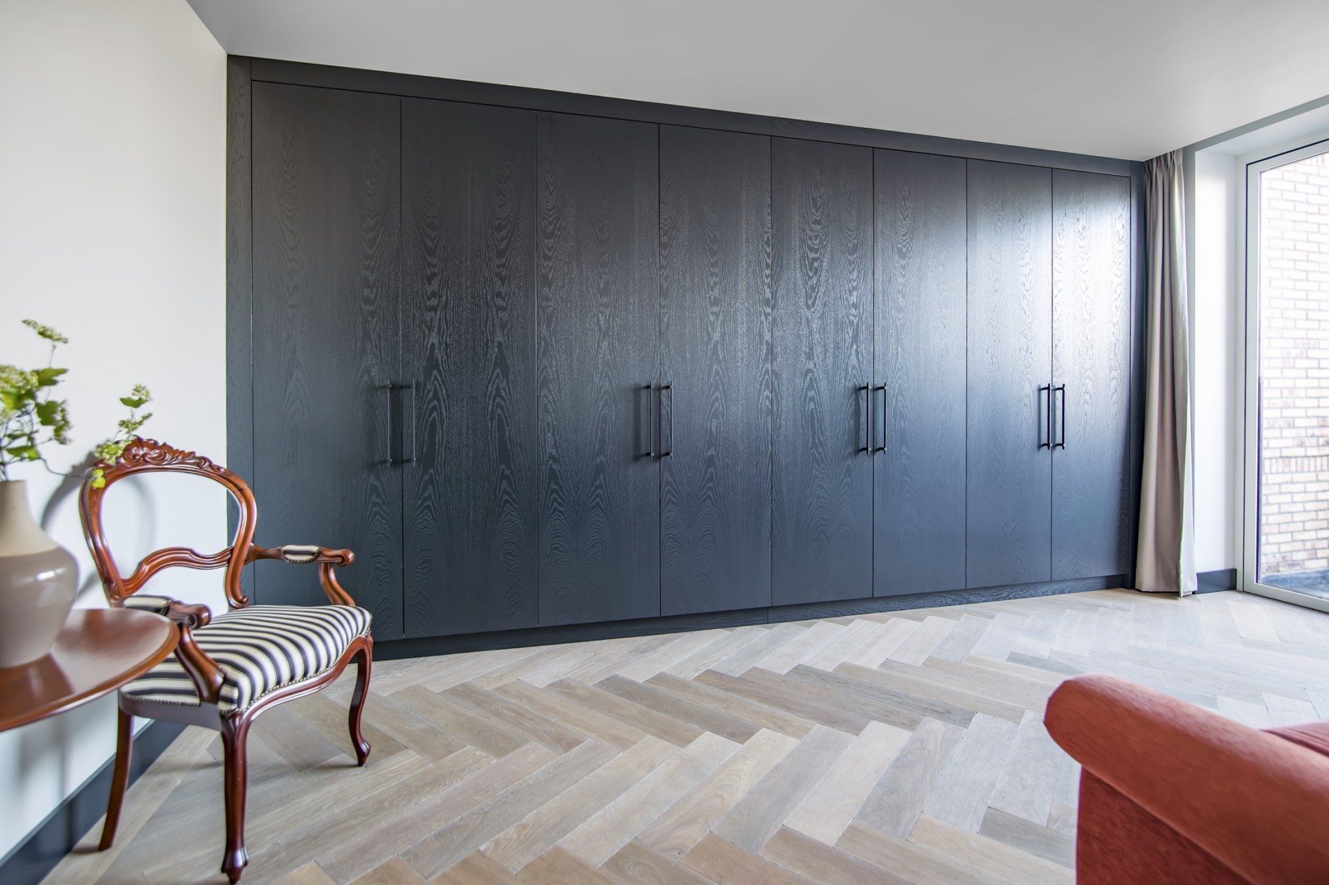 Deze kasten zijn gemaakt van gefineerd eiken, afgewerkt met zijdeglans spuitwerk in de kleur Farrow & Ball off black. De kledingkast is voorzien van diverse accessoires; schoenenrekken, pantalonrekken en kledingliften. Kledingliften geven gemak aan de kast.
