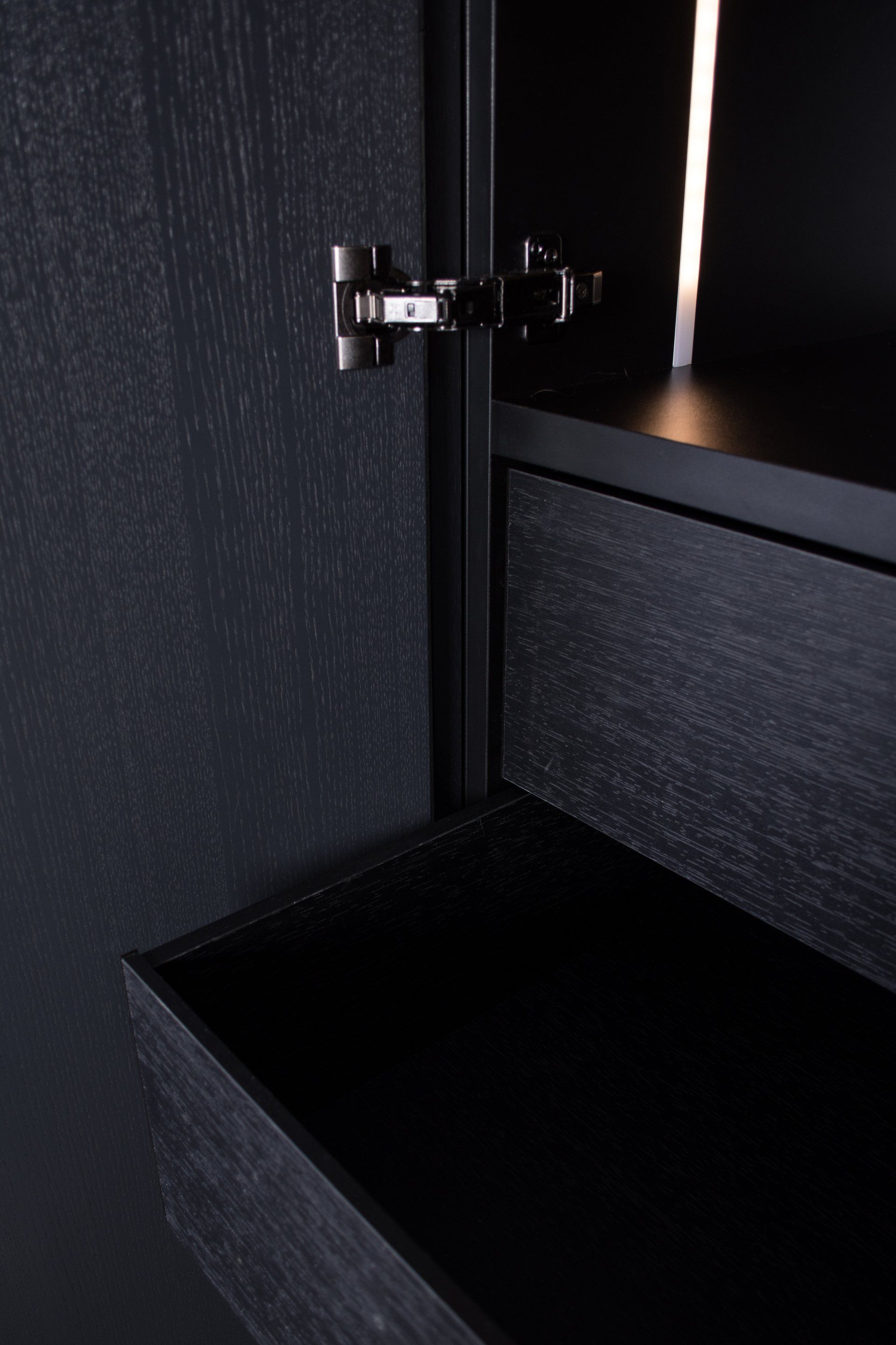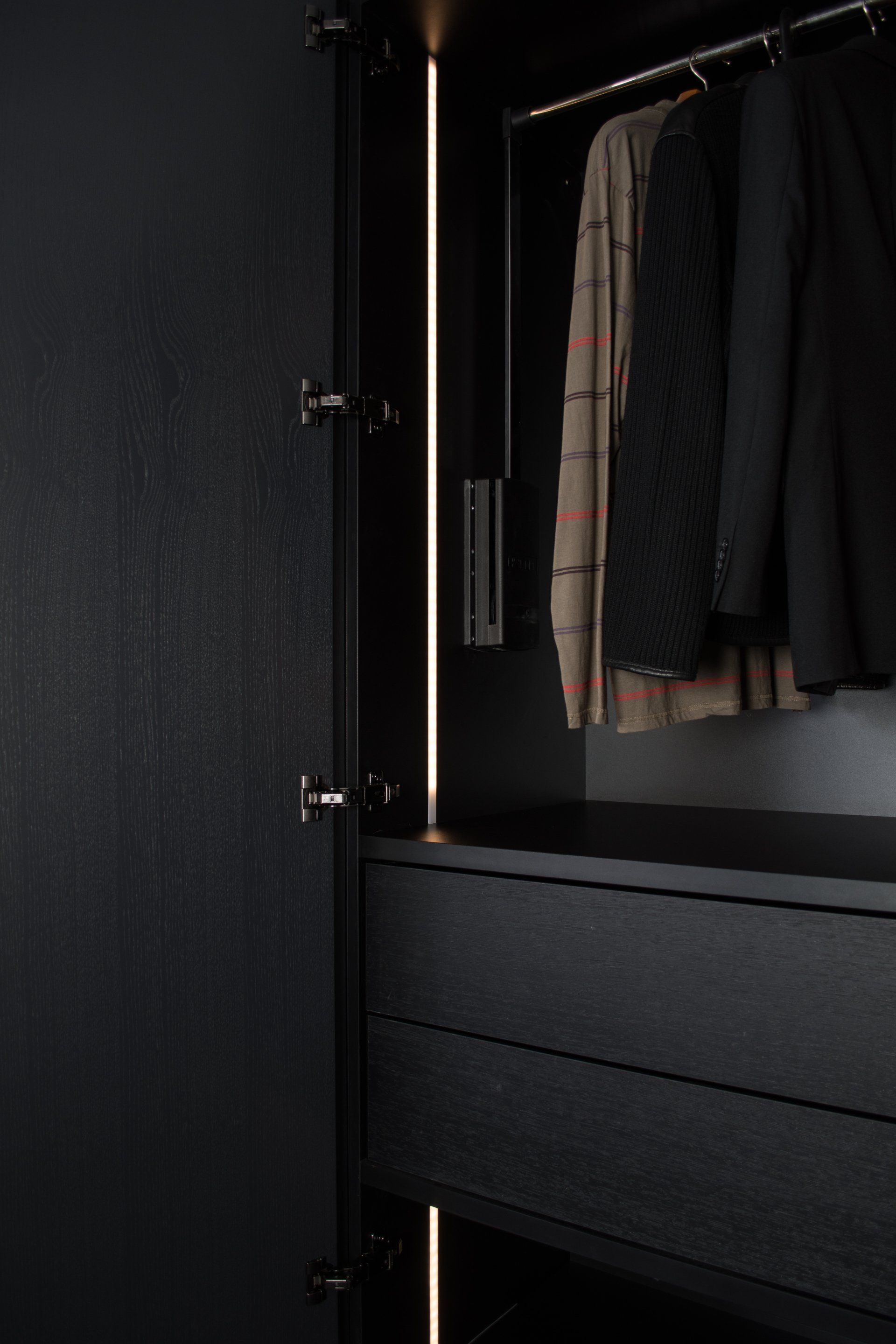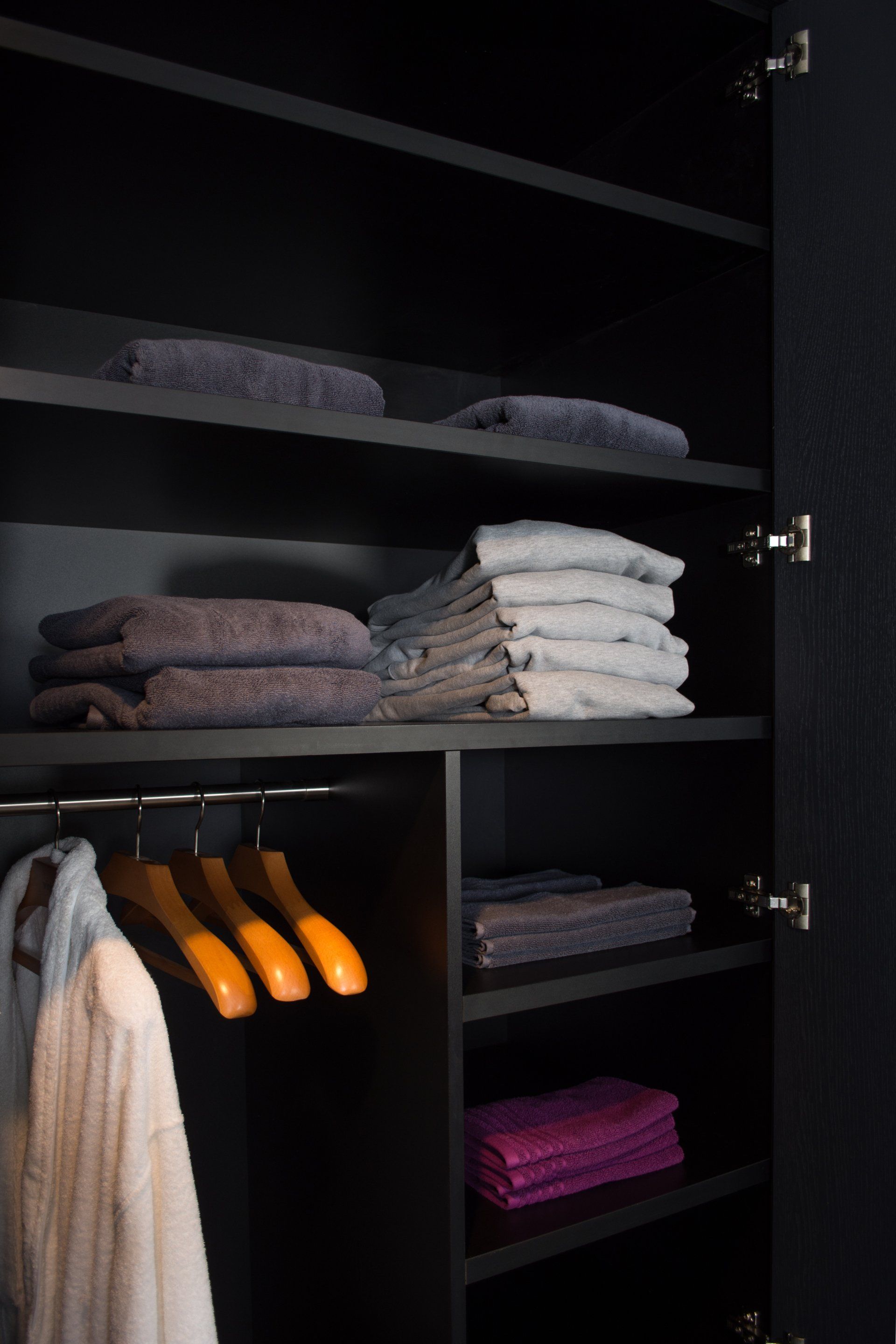 Deze kast is gemaakt van gefineerd eiken en gespoten in de kleur Off Black van Farrow and Ball. In de kast laten wij diverse accessoires zien waaronder een kledinglift.