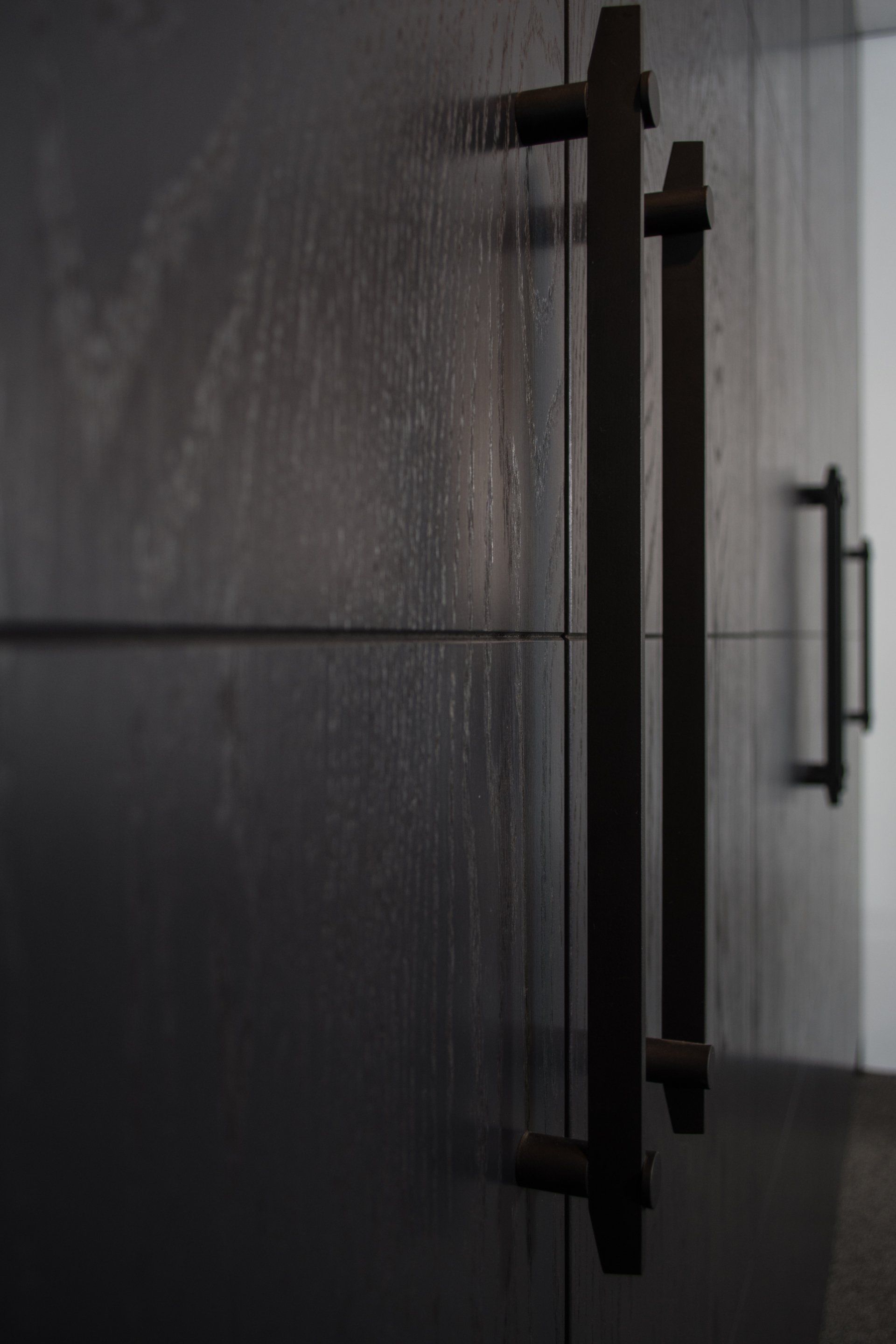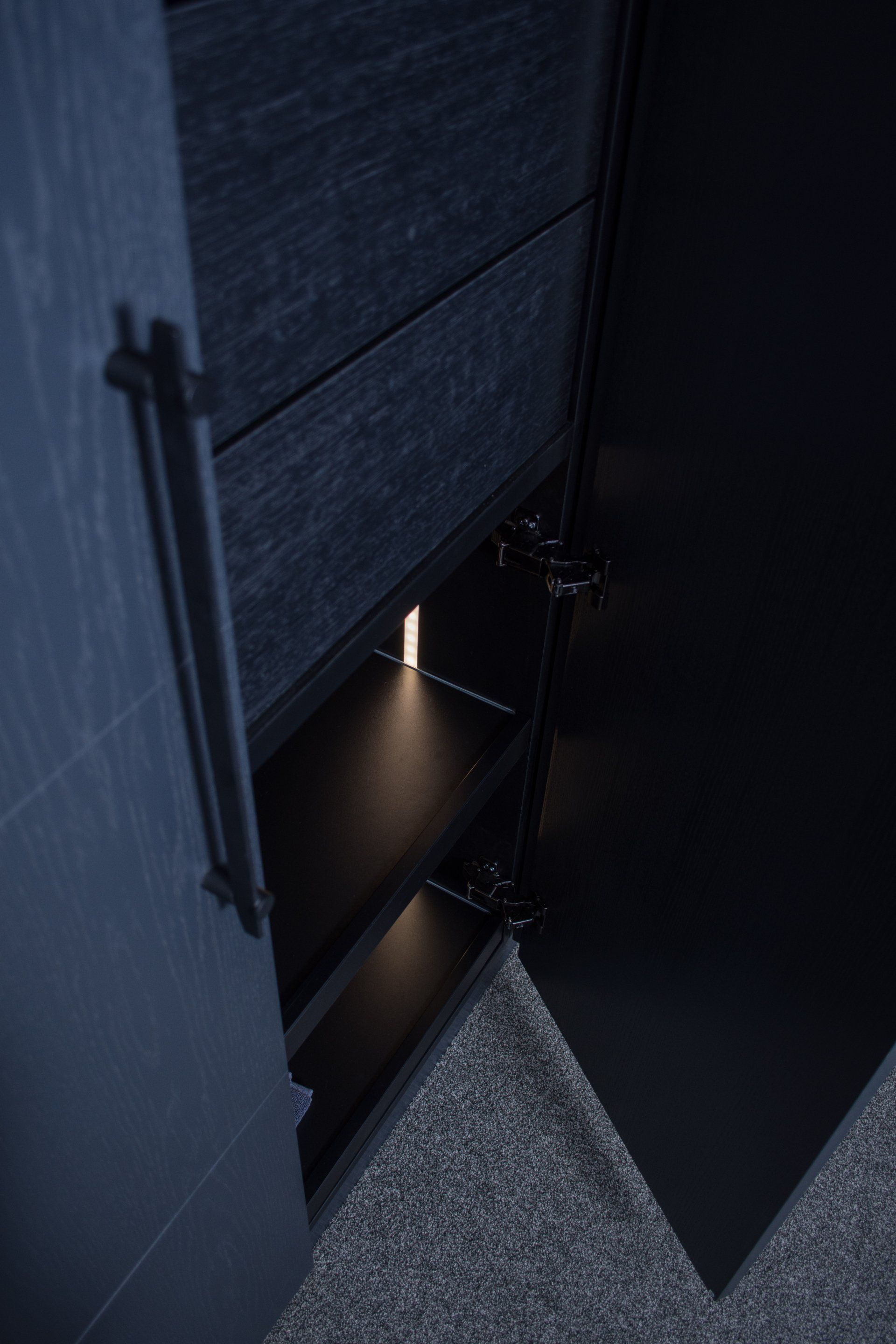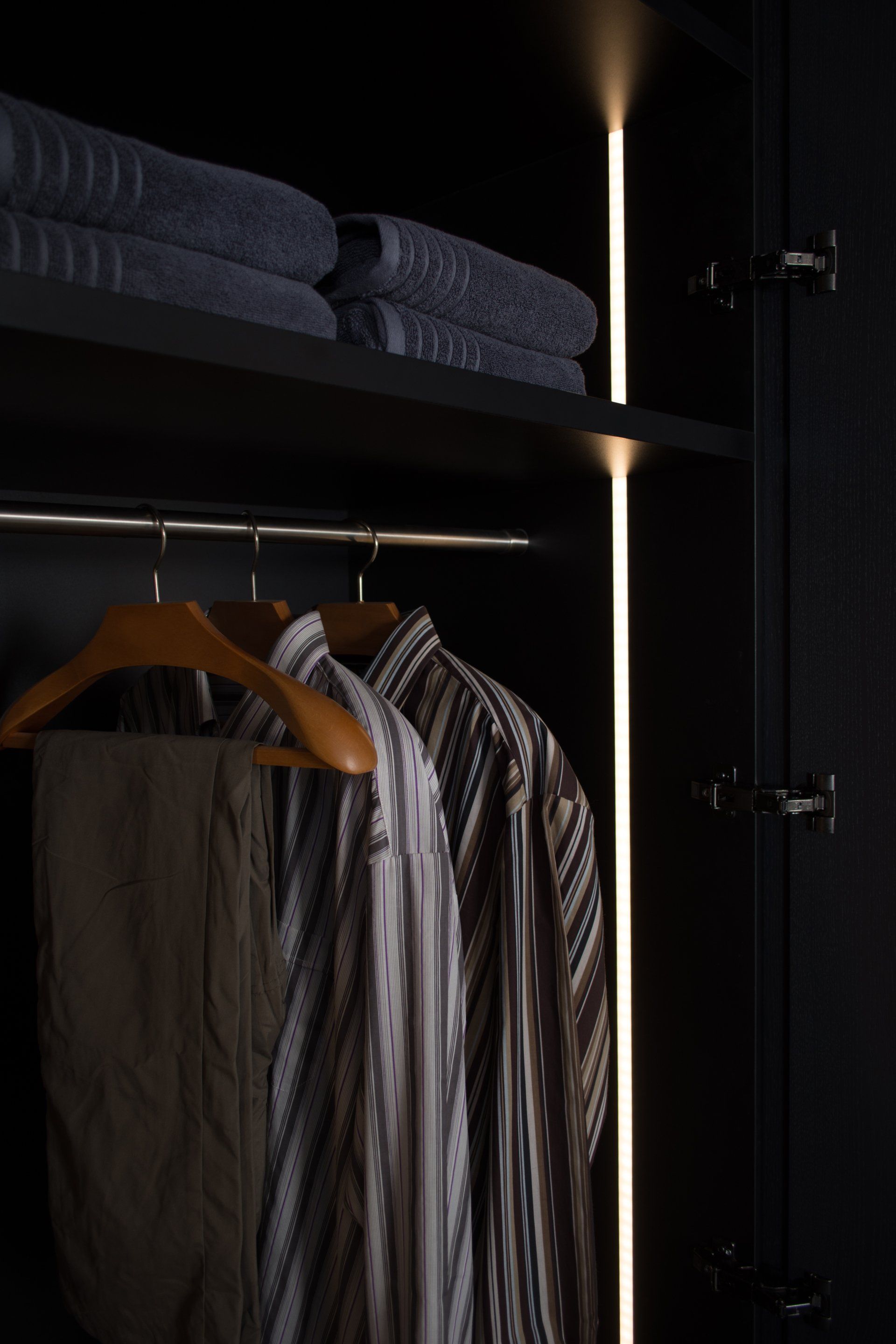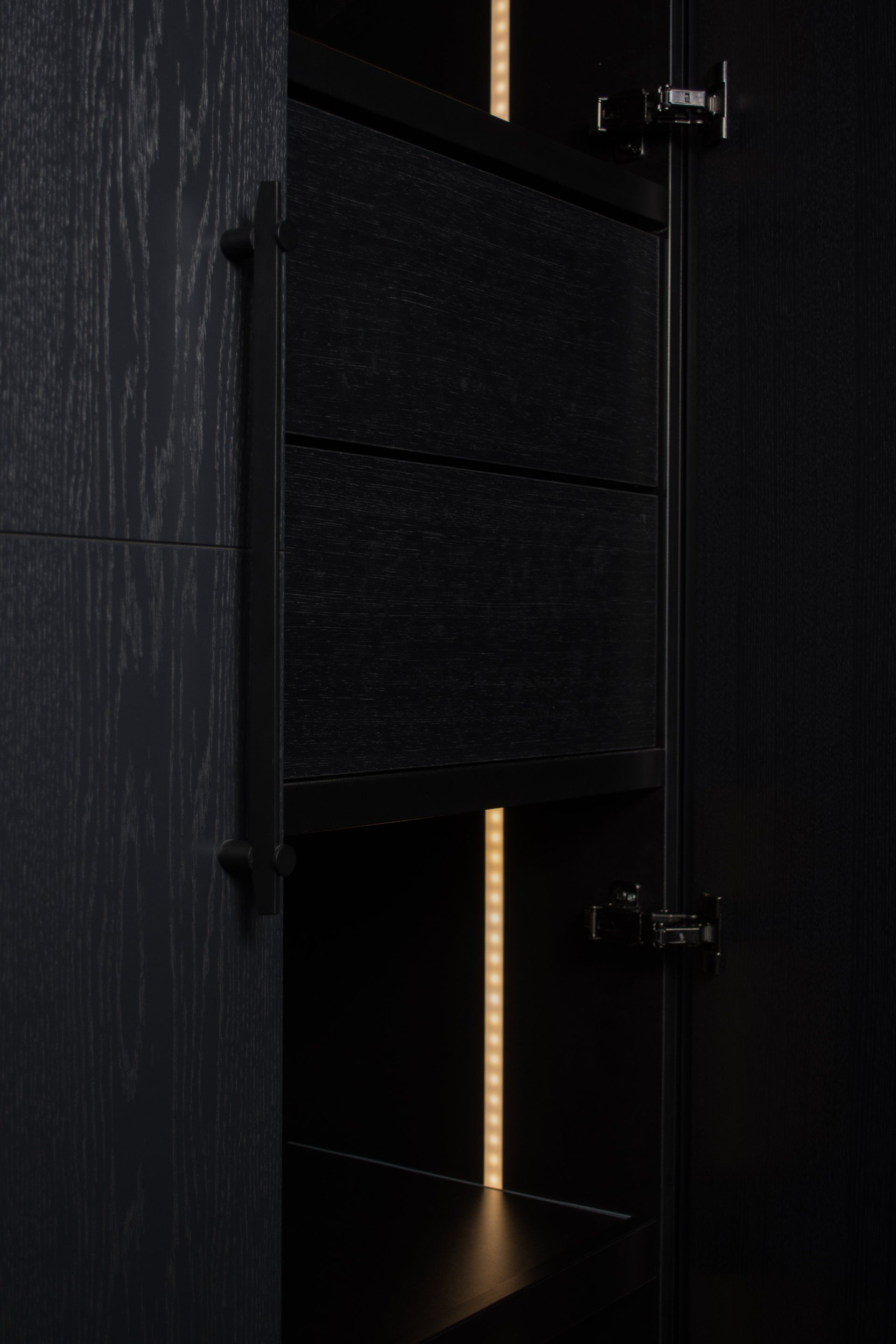 Deze kast is gemaakt van gefineerd eiken en gespoten in de kleur Off Black van Farrow and Ball. In de kast laten wij diverse accessoires zien waaronder een kledinglift.