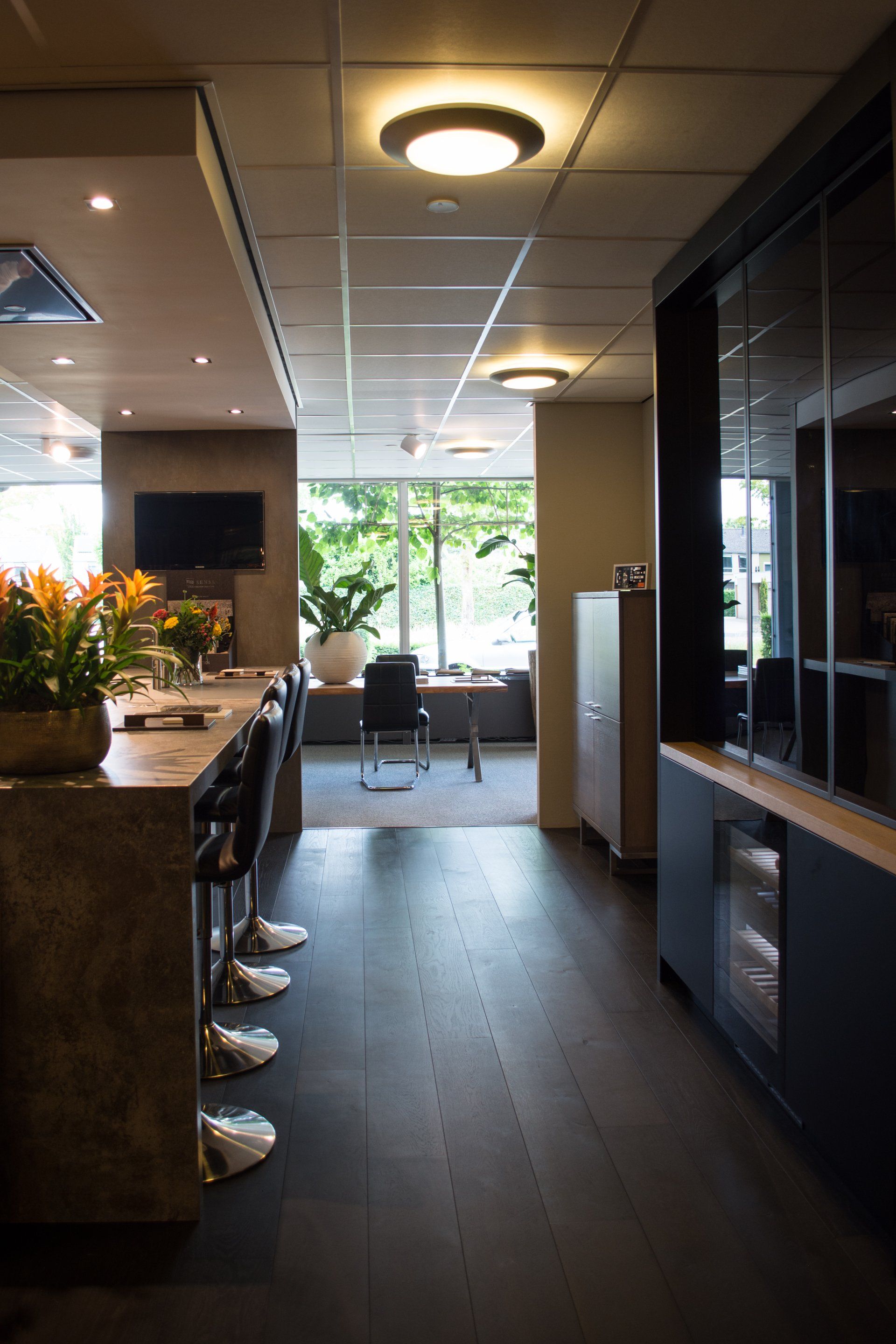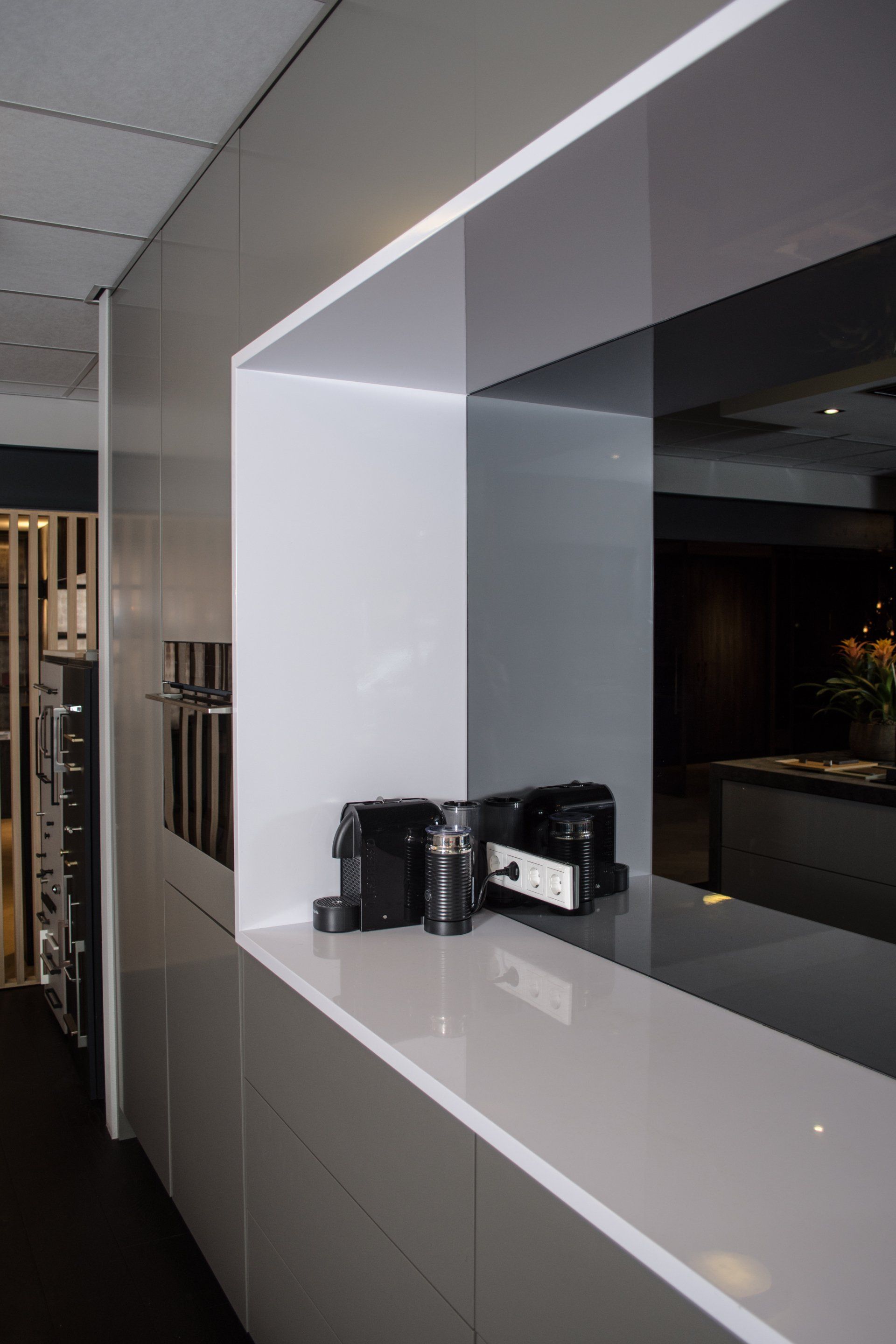 De witte ladefronten zijn gemaakt van V313 vochtwerend MDF en afgewerkt met hoogglans spuitwerk. De hoge kastenwand is gemaakt van V313 vochtwerend MDF en afgewerkt met mat spuitwerk.