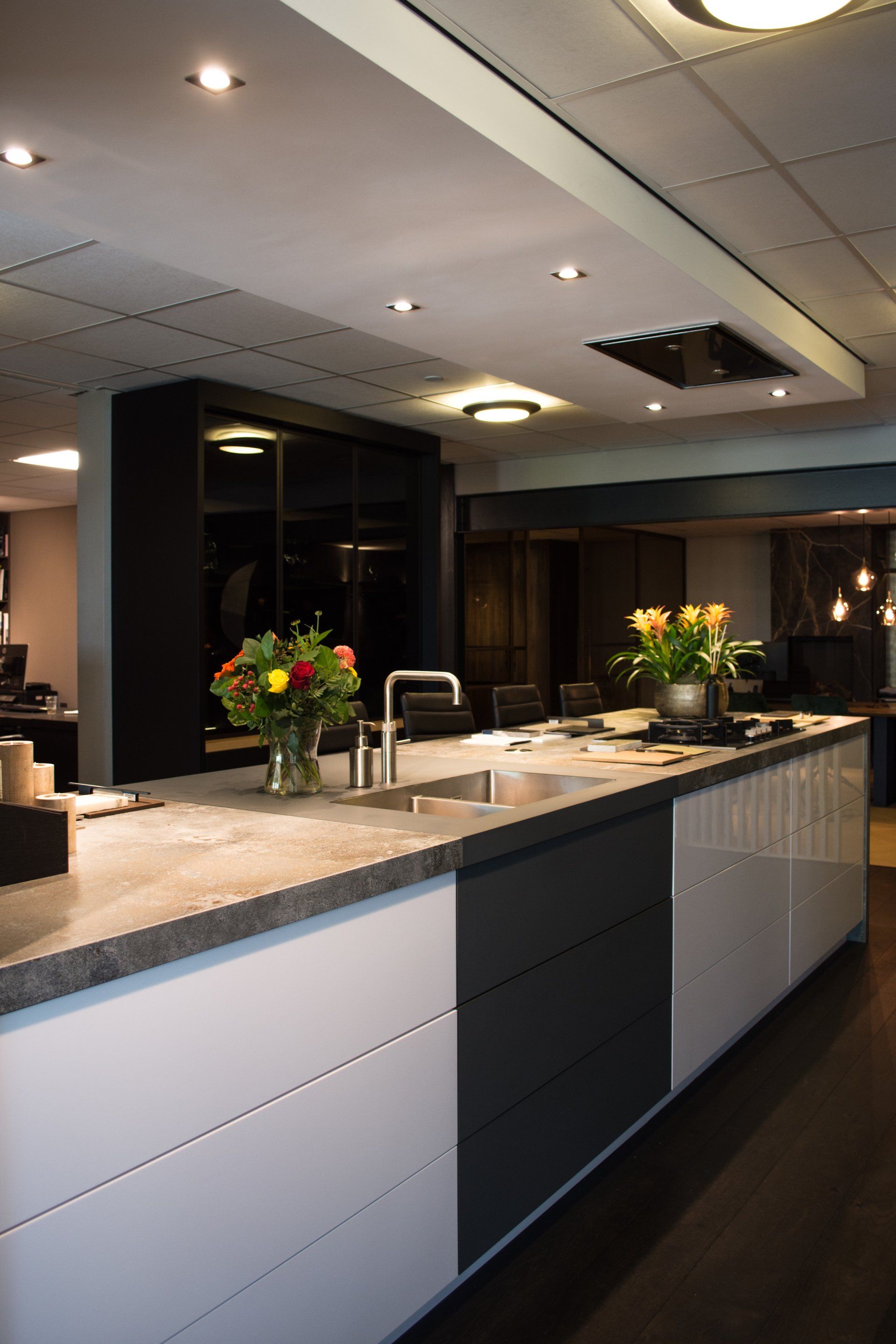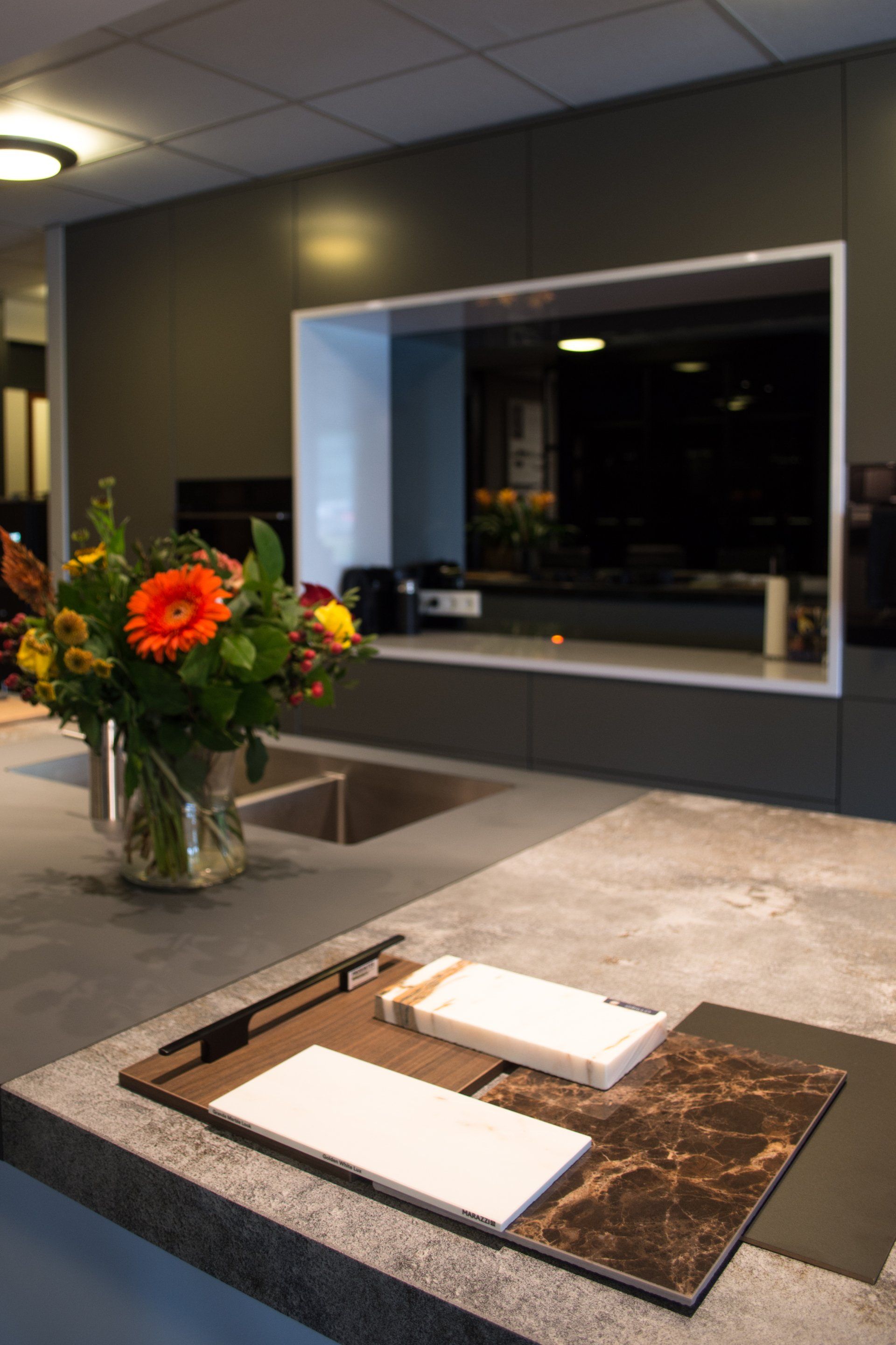 Het keukenblad is gemaakt van 2 soorten materialen; het tussenstuk is gemaakt van HPL en de andere delen zijn gemaakt van Dekton.