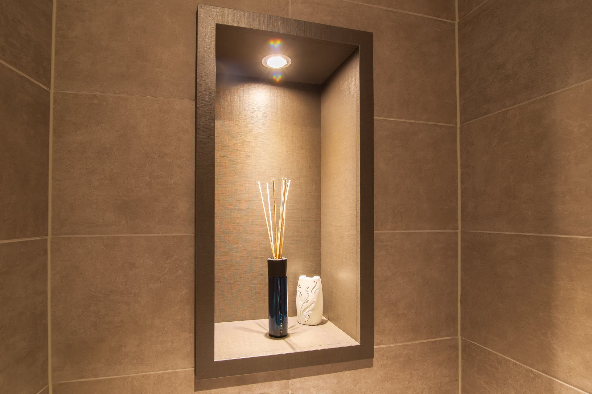 De nis in deze toiletruimte is gemaakt van gemelamineerd plaatmateriaal in de kleur FA46 Penelope van het merk Decolegno.