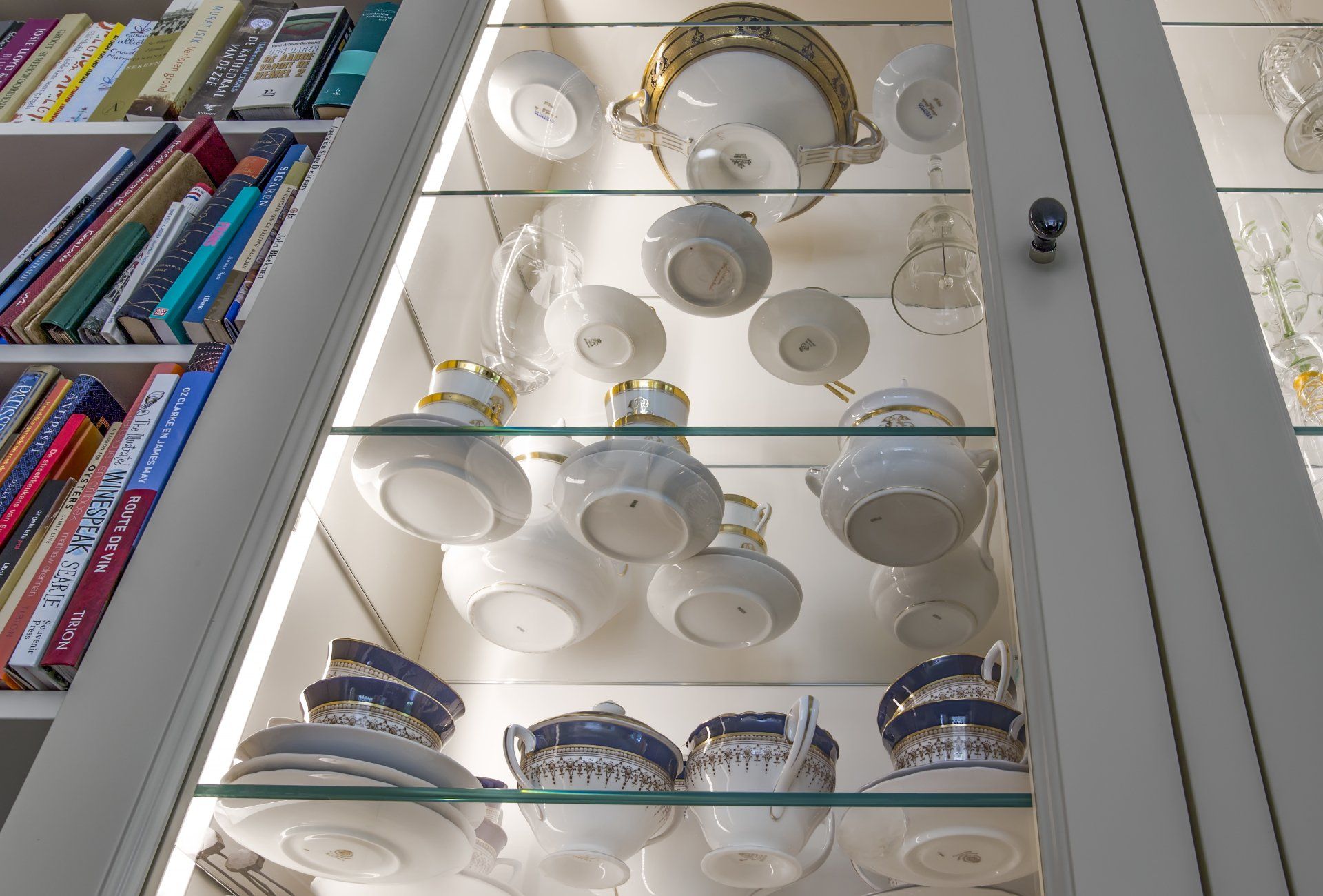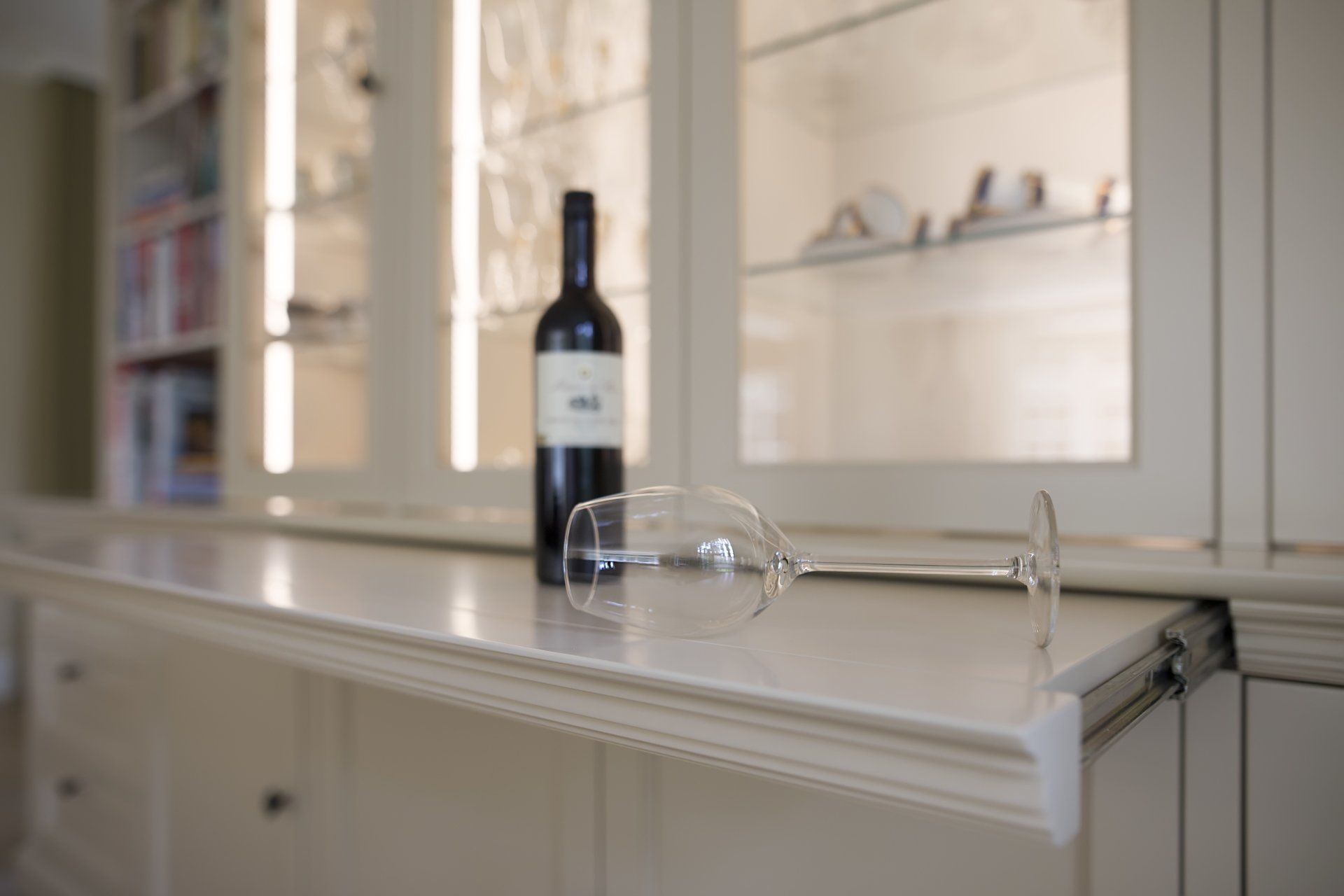 Deze prachtige woonkamerkast is gemaakt van V313 vochtwerend MDF, afgewerkt met zijdeglans spuitwerk. De kast is voorzien van van een kroonlijst die ook is gemaakt van V313 vochtwerend MDF en is afgewerkt met zijdeglans spuitwerk. In de kast zijn legplanken gemonteerd van gehard glas die zijn bevestigd door middel van glasdragers. Aan de zijkanten is een led strip geplaatst om de kast mooi uit te lichten.